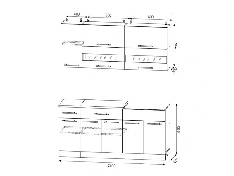 Материал фасадов: ЛДСП. Комплектация: Шкаф нижний с ящиком 400 мм  Шкаф нижний с ящиком 800 мм Шкаф нижний под мойку 800 мм Шкаф верхний 400 мм Шкаф верхний 800 мм - 2 шт. Столешница помодульная. Модуль под мойку рассчитан под накладную мойку. Мойка приобретается дополнительно.